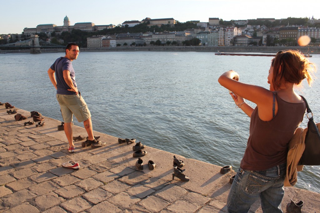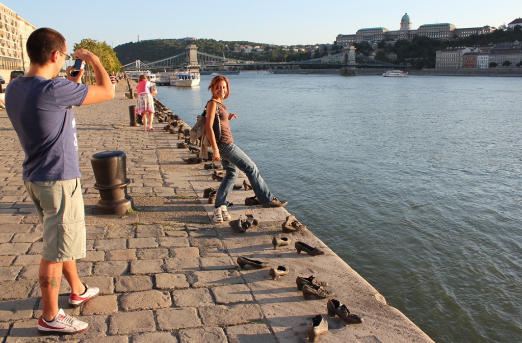 Stretching before me is Pauer and Togay’s monument to the victims shot by the Arrow Cross in 1944-5 – the Shoes on the Danube Promenade Memorial. Sixty pairs of cast iron shoes are abandoned on the edge of the river, placed as if their owners had just stepped out of them.